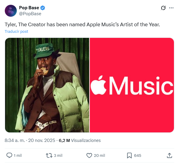Apple Music no solo elogió su música, sino también su espíritu creativo: el equipo de la plataforma aseguró que Tyler representa una “voz generacional que nunca deja de desafiar expectativas”.